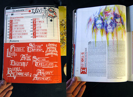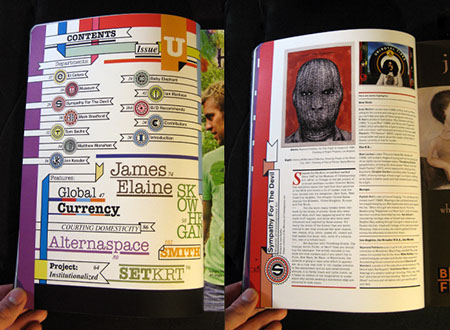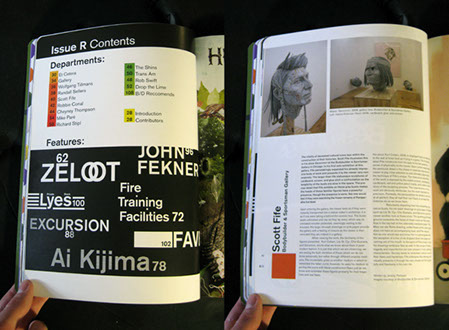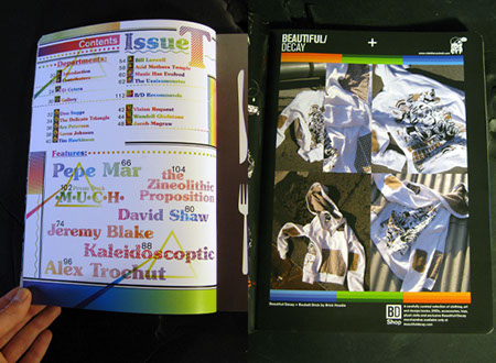 While at Beautiful/Decay my role, among others, was to design the quarterly art/design/grafitti/music/fashion publication. The design of each issue of Beautiful/Decay shown here was a response to the particular theme of that issue, or in the case of Issue R, a themeless and thus neutral issue, an attempt to define the structure of things to come. After this system was established, it carried over into all subsequent issues as a way to keep things the same, yet different. Subsequent issues feature many variations and plays on this structure through the use of typography, lettering, decorational illustrations and other theme specific decorational devices.